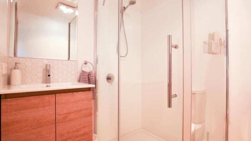 – Two bathrooms – one with a bath, hair dryer, heated towel rack, both with showers