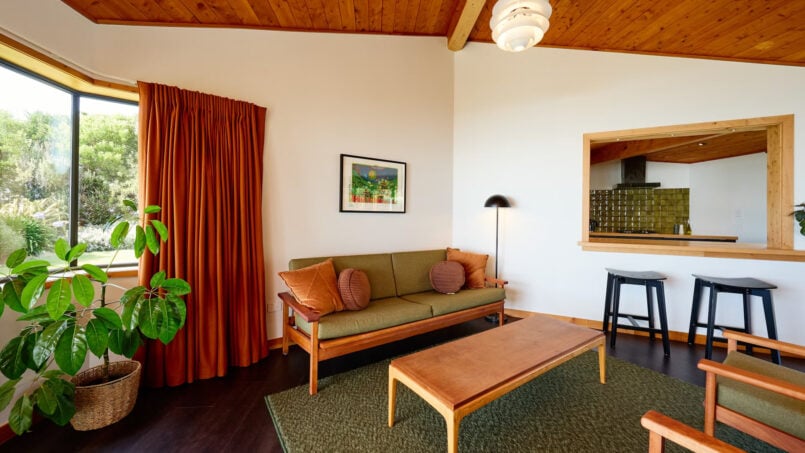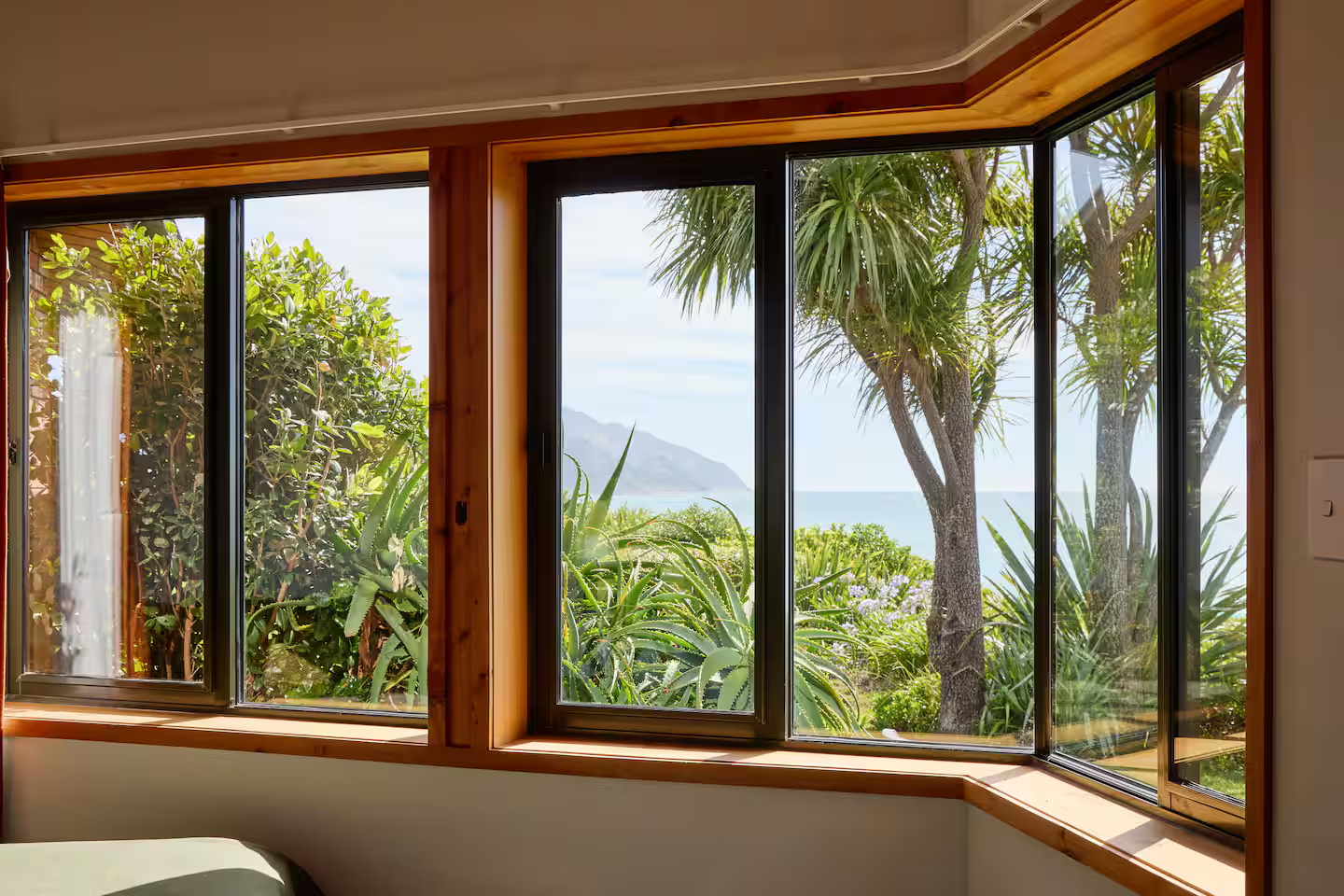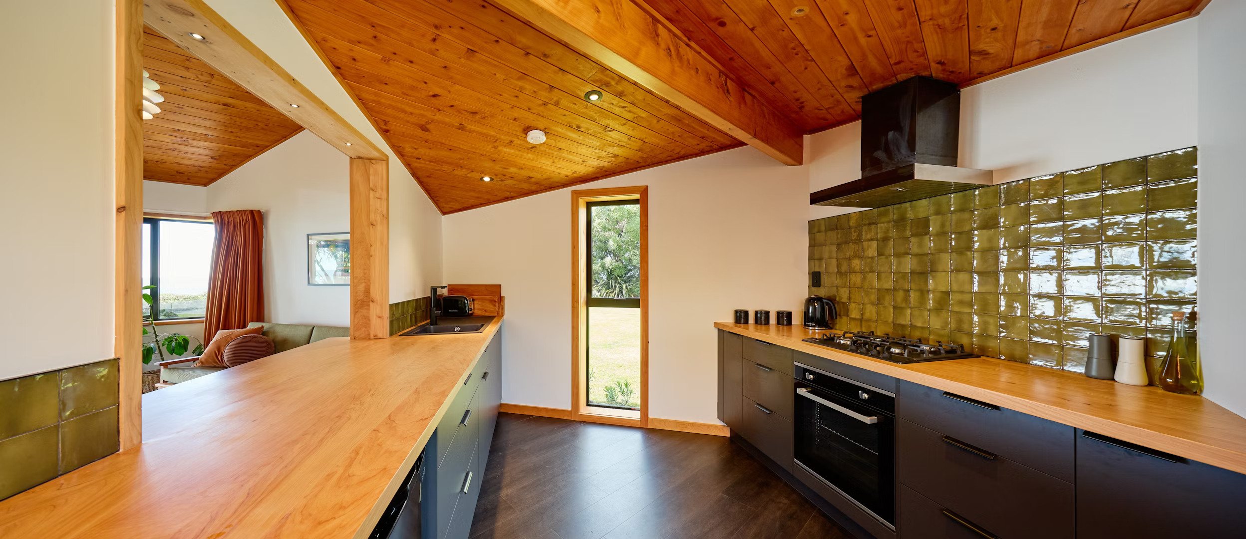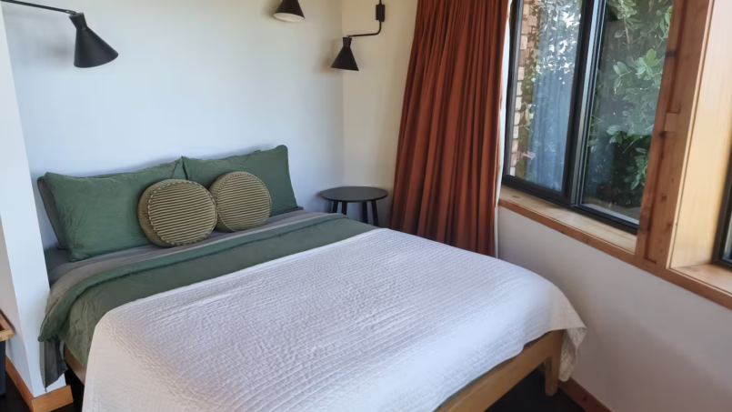 The Hapuku Studio is architecturally designed elegance paired with stunning mid-century furnishings. Newly renovated with an open-plan layout, the Studio features a cozy queen-size bed and a fully equipped kitchen with a fridge, gas stovetop, oven, toaster, and kettle. The modern bathroom includes a sleek shower and toilet for your comfort. Step through the French doors onto the deck, where you’ll be greeted by breathtaking views of the gardens and the beach below—an idyllic retreat for relaxation and beauty.
