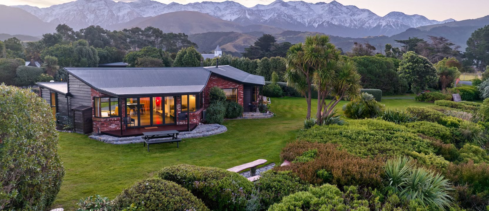 Discover the enchanting Hapuku where breathtaking ocean and mountain views await you year-round. Nestled in a peaceful and secluded setting, our property offers some of the most spectacular vistas in Kaikoura. Wander through five acres of gardens, featuring fruit orchards and sculpted native bush. Located on the Mangamaunu coastline, we’re just a two-minute stroll from the world-famous surf beach. Unwind and rejuvenate in one of New Zealand’s most stunning and unique locations.